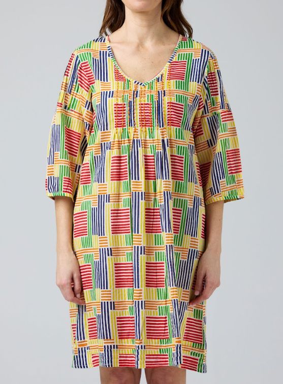 3/4 sleeve dress with front gathers, side pockets and embroidery