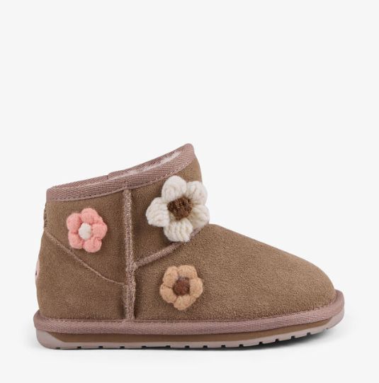 Sweet, soft, and blooming with personality. The Emu Kids Daisy mini boot features a daisy design, soft Merino wool lining and a flexible sole made for play.