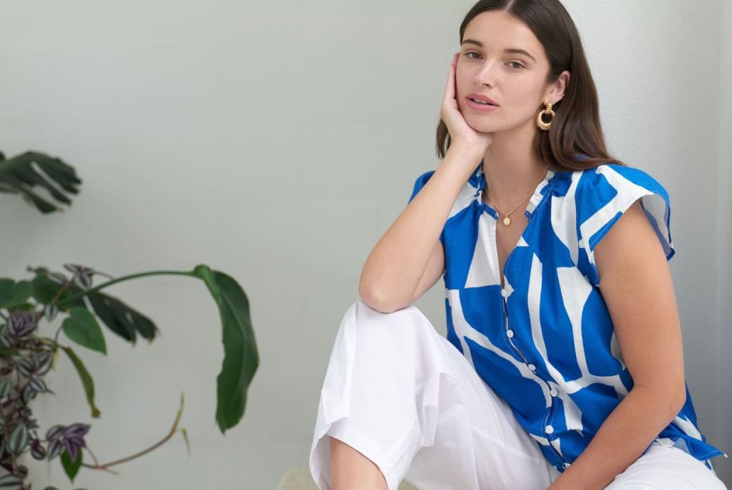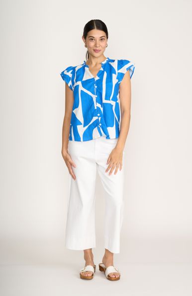 Brighten your wardrobe with the AS A BUTTON TOP in the striking Reflection print. Crafted from a breathable linen-cotton blend, this lightweight top features a relaxed silhouette, cap sleeves, and a button-through front for easy wear. Perfect for pairing with shorts, skirts, or wide-leg pants for effortless summer style.
