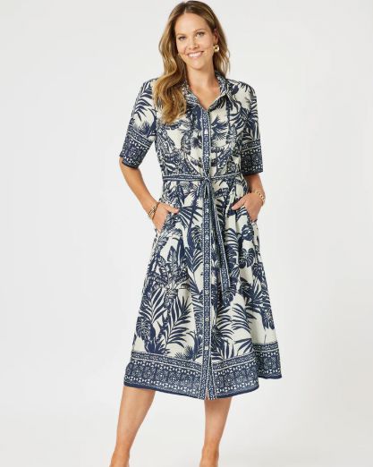 A versatile wardrobe essential, the Palm Cove Dress by Gordon Smith can be worn buttoned up for a chic, polished look or styled open as a breezy duster. Featuring a tropical palm print in a classic navy and ivory palette, this midi-length dress has short sleeves, a self-tie waist belt for flattering shaping, and practical side pockets. Whether layered over swimwear for a resort-ready vibe or paired with heels for an effortless day-to-night transition, it’s the ultimate blend of style and versatility.