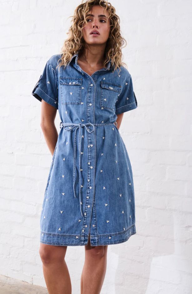 The Simone Dress is the easy mini shirtdress with a cool twist. Featuring patch utility pockets, buttons all down the front and an embroidered heart detail this is one-and-done kind of style that can be paired with sneakers for a cool, casual vibe.