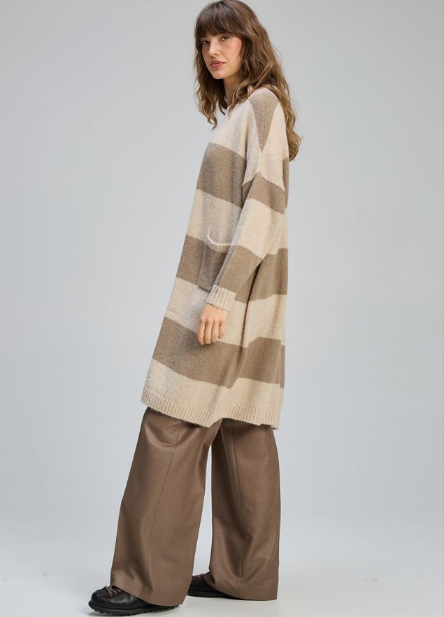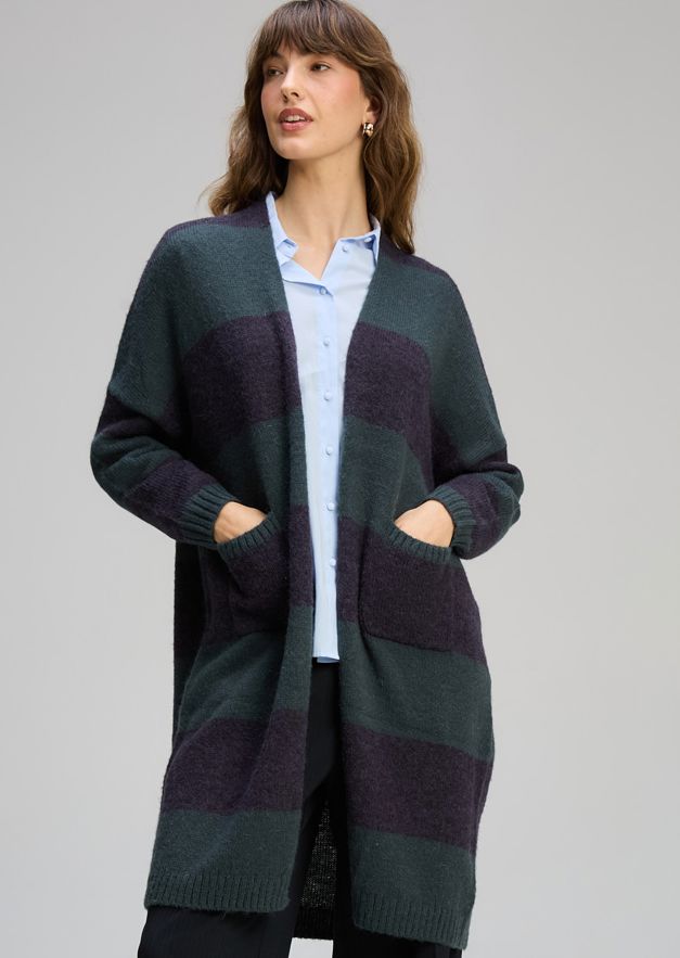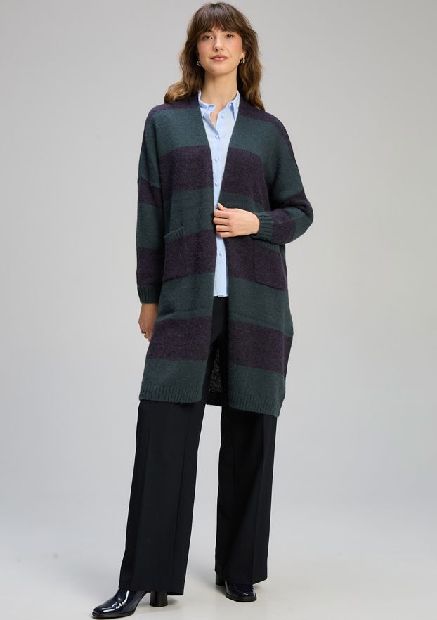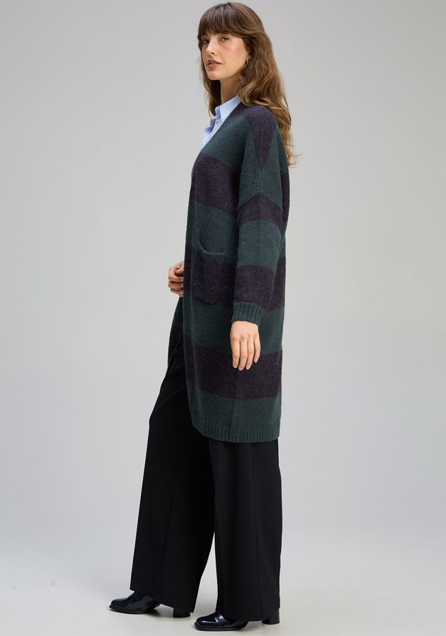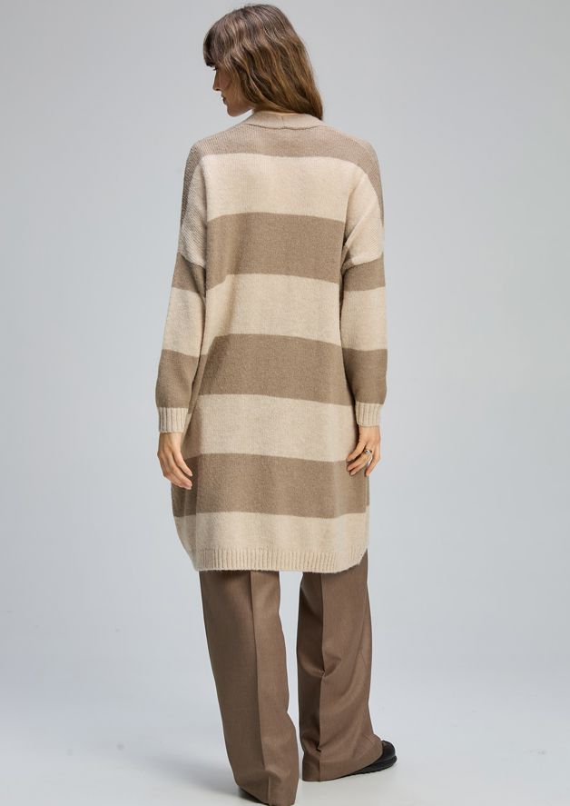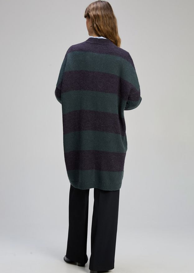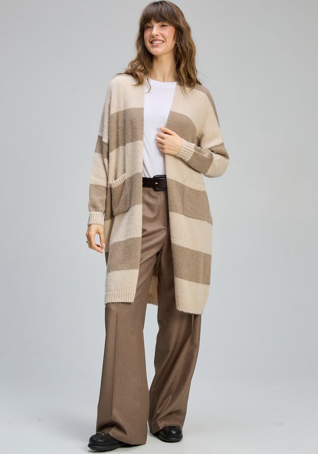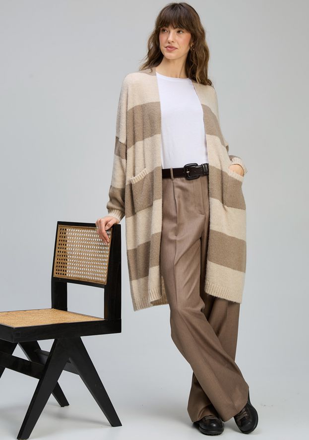Crafted from a breathable knit of merino wool and mohair, it feels light yet cosy, making it ideal for transitional seasons and travel. The elongated shape adds elegance and versatility, allowing it to be worn open over dresses, trousers, or relaxed separates. It brings quiet confidence to simple outfits and instantly elevates everyday looks.
